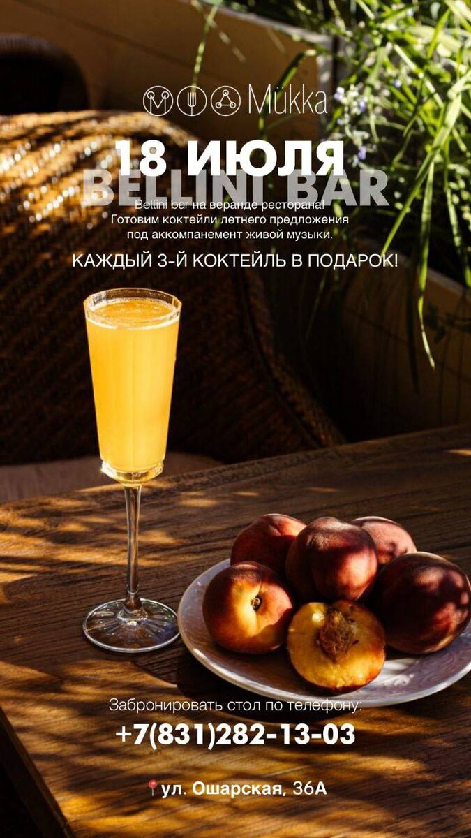 18 июля с 18:00 ресторан Мукка Встречаемся с Вами на коктейль беллини 🤌🏼 В меню ресторана 5 видов беллини!!! Вечером на веранде будет работать бармен за стойкой. Живая музыка и вокал. Акция для гостей: третий коктейль в подарок Столики бронируйте по телефону: +78312821303