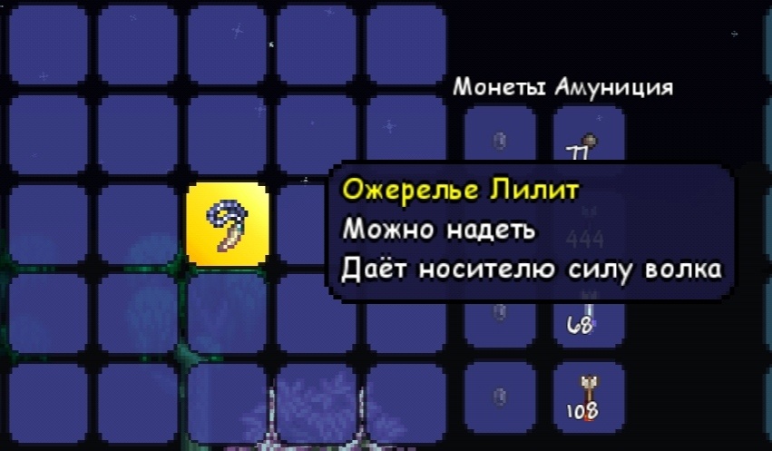 Вы знали, что можете стать волком в террарии? Всем привет, с вами Кайто и сегодня я вам расскажу об одном необычном предмете. Ожерелье Лилит - аксессуар, превращающий игрока в волка. Выбить данное снаряжение можно с волка. Данный монстр появляется ночью в снежном биоме в режиме хардмода. Лично мне этот предмет нравится. А вы что думаете про Ожерелье Лилит? Спасибо за внимание!