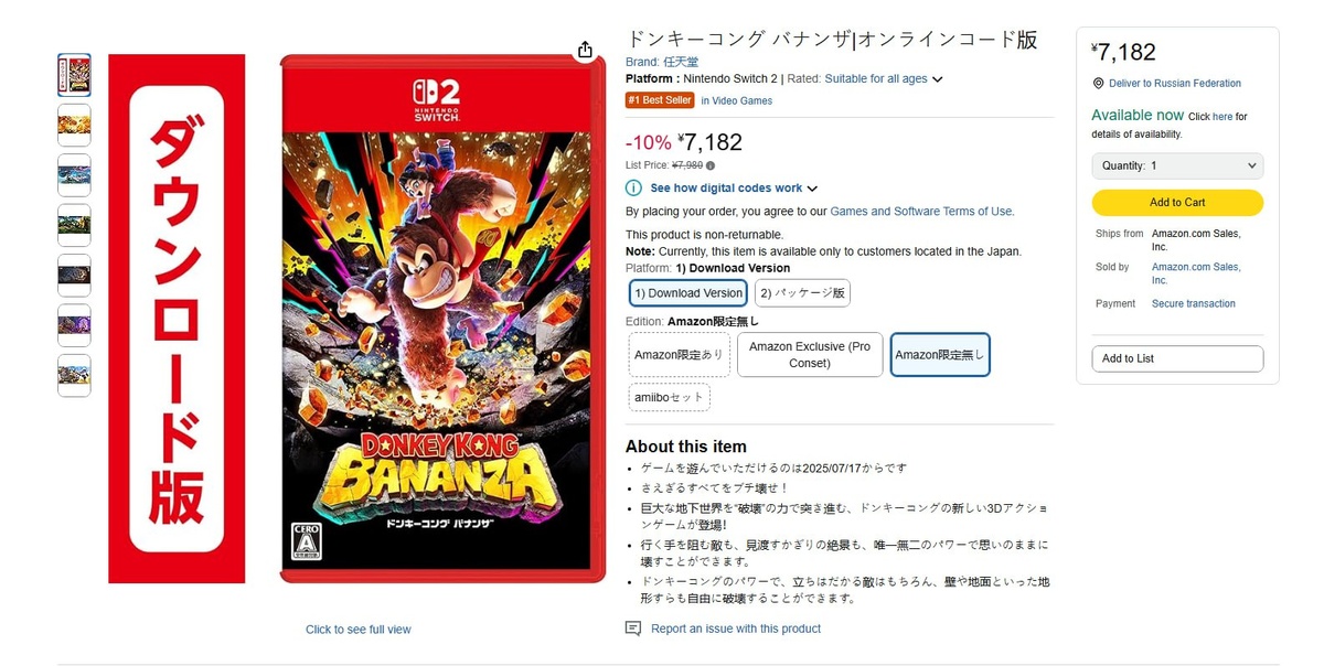 В ответ на пост Я был не в курсе, но вот пара выгодных возможностей купить Donkey Kong Bananza — но в каждом случае нужна зарубежная банковская карта (например, казахстанская, белорусская, грузинская, турецкая). • В гонконгском eShop можно покупать игры с этих карт — и там Donkey Kong Bananza стоит 449 гонконгских долларов, что примерно 4500-4700 рублей. • На японском Amazon продают ключи для игр на Switch, там сейчас Donkey Kong Bananza можно взять за 7182 йены, что примерно 3800 рублей.