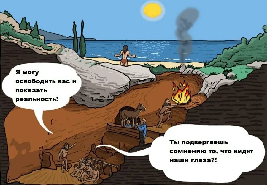 Платон зовёт нас менять тени в пещере. Я же говорю: разбейте цепи и выйдите на солнце! Но нет — его ученики предпочитают обсуждать "идею свободы", сидя в темноте. Платон описывает группу людей, которые с рождения живут в пещере, привязанными цепями так, что они не могут двигаться и видят только стену перед собой. За их спинами горит огонь, а между ними и огнём проходит перегородка, по которой люди носят различные предметы. Тени этих предметов отбрасываются на стену перед заключёнными, и они принимают эти тени за реальность. Для них эти тени и есть весь мир , поскольку они никогда не видели ничего другого. Если один из пленников освобождается и выходит из пещеры, он сначала ослеплен ярким светом и не может понять, что видит. Постепенно его глаза привыкают, и он начинает видеть настоящее — деревья, людей, солнце. Он понимает, что тени в пещере были лишь отражением реального мира. Но когда он возвращается обратно в пещеру, чтобы рассказать другим о том, что узнал, его товарищи не верят ем