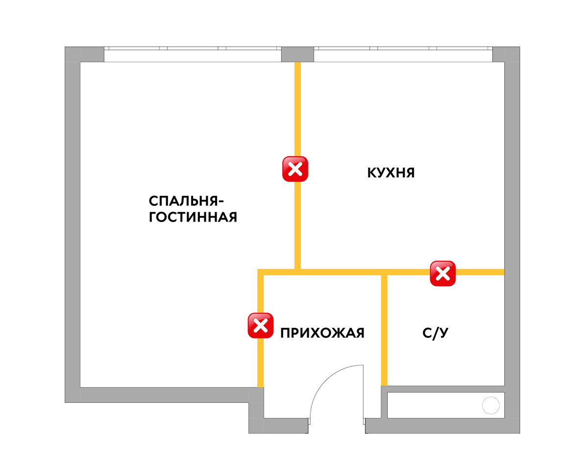 В этой статье я расскажу про планировочное решение в проекте. Результат и реализация дизайн-проекта в конце статьи 👇 Заказчица пришла с запросом сделать многофункциональное пространство. Так как квартира с небольшой площадью, она хотела получить мебель-трансформер. Плюс у заказчицы очень много вещей, она любит порядок. Поэтому ей было важно хорошо организовать хранение. Она попросила сделать вместительную гардеробную. Так как это апартаменты, серьезных ограничений по планировке не было. Но в УК попросили сохранить границы санузла. Это мы и сделали. Квартира была изначально без стен, в черновой отделке. На схеме выше показана предложенная от застройщика планировка. Что в ней не так? Мы сократили прихожую в пользу увеличения спальни-гостиной. Дверь между прихожей и остальными помещениями решили не делать. Теперь в прихожей появился естественный свет. При входе в квартиру сразу открывается панорамный вид. Северную неосвещенную часть спальни-гостиной преобразовали в гардеробную с раздви