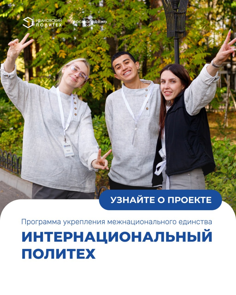 Российских и иностранных первокурсников Ивановского Политеха ждут сюрпризы! Наш университет запускает Программу укрепления межнационального единства «Интернациональный Политех». Это комплекс научно-образовательных площадок и культурных мероприятий, направленных на интеграцию национальных культур в общеуниверситетскую среду ИВГПУ. Программа реализуется пятый год подряд, и пятый год у иностранных студентов Политеха есть возможность с первых дней пребывания в России принять участие в мероприятиях, которые помогут им быстрее адаптироваться в новой для них стране. Подробнее о проекте читайте ЗДЕСЬ Привет, посты с грантовыми проектами заканчиваем так👇🏻 Проект реализуется при грантовой поддержке Федерального агентства по делам молодёжи — Росмолодёжь #РосмолодёжьГранты #Росмолодёжь #Политех_Интернациональный