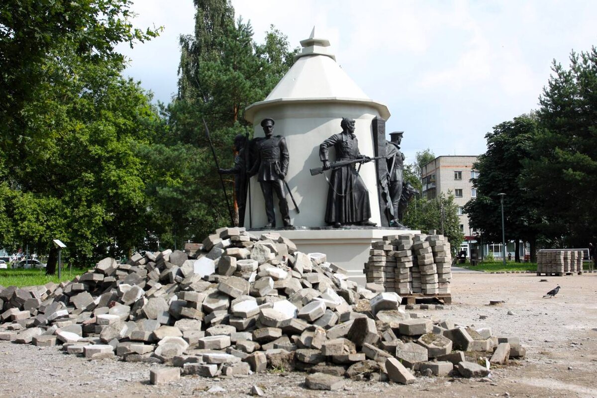 Работы по обновлению покрытия вокруг памятника ведутся в сквере Пограничников в Пскове