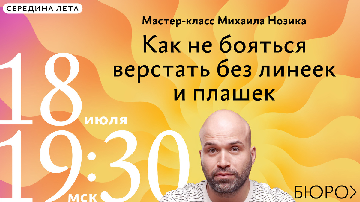 В пятницу 18 июля в 19:30 мск Михаил Нозик проведёт бесплатный мастер‑класс выразительного дизайна. Миша — арт‑директор бюро, соавтор «Советов» и преподаватель дисциплины «Типографика и вёрстка». Миша расскажет, чем могут быть вредны плашки и линейки в дизайне, покажет, как собрать выразительный и понятый макет без единой плашки, и научит не бояться собирать плотные макеты. Мастер‑класс полезен начинающим и опытным дизайнерам, редакторам, разработчикам и менеджерам. Записаться на мастер‑класс Прошла ровно половина лета — а в этом году ещё столько предстоит изучить! Чтобы подстегнуть вашу тягу к знаниям, бюро отмечает середину лета и приглашает дизайнеров, редакторов и руководителей усиленно прокачать знания и навыки. Только неделю с 14 июля преподаватели бюро проводят бесплатные мастер‑классы, а на электронные продукты бюро действует скидка 25%. Читайте книги, смотрите лекции, проходите подготовительные курсы, учитесь в наших школах — набирайтесь знаний, пока все остальные киснут от жа