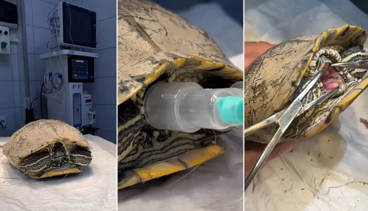 Любители рыбалки, заметившие необычного «улов», отнесли её в ветлечебницу. Там животное усыпили ингаляционным наркозом и оперативно извлекли инородное тело — рыболовный крючок вместе с наживкой и остатками лески. После обработки раны врачами стало ясно, что черепаха скоро поправится.