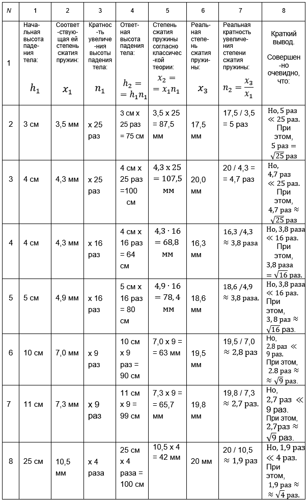 Только реально произведенное мною сбрасывание этого цилиндра с высоты, равной, именно 75 см, показывает нам то, что, в действительности, пружина окажется сжатой при этом только лишь на величину 17,5 мм, как это и показано мною в 6-м столбце 2-й строки этой таблицы.