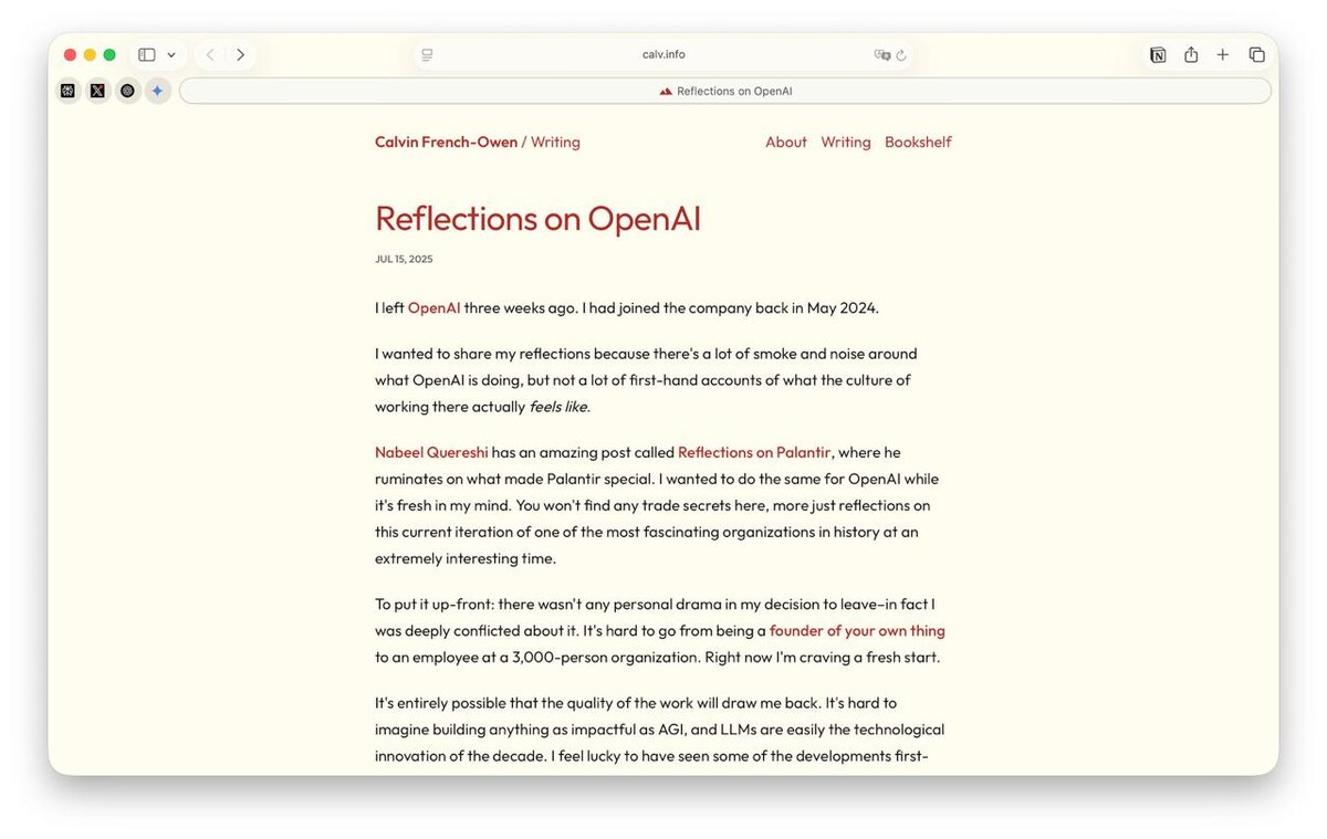 Размышления бывшего работника OpenAI о внутренней кухне компании Calvin French‑Owen поделился своими наблюдениями о работе в OpenAI. Никаких сенсаций или пугающих откровений в его заметках нет. Автор просто интересно рассказал о внутренних процессах компании. Например, любопытный факт о Codex — этот продукт был создан всего за 7 недель командой из 17 человек. Также он упомянул, что в компании не используют корпоративную почту, а вся коммуникация происходит через Slack. И множество других подобных деталей. https://calv.info/openai-reflections INCUBE.AI | ПОДПИСАТЬСЯ