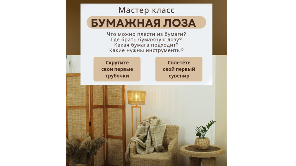 19 и 26 июля в Городском выставочном зале Брянска пройдёт мастер-класс - знакомство с бумажной лозой. Начало в 13:30. Участники мастер-класса узнают: - что такое бумажная лоза, - все этапы создания лозы, - узнаете секреты идеальной лозы, - как и где правильно выбрать бумагу, - этапы создания изделий, - необходимые материалы и инструменты. На мастер-классе участники скрутят не только свои первые трубочки, но и сплетут свой первый сувенир. Запись обязательна, количество мест ограничено. По всем вопросам обращайтесь к мастеру Катерине в личные сообщения и по телефону 89102351981. 12+ Брянцев приглашают на мастер-класс «Бумажная лоза»