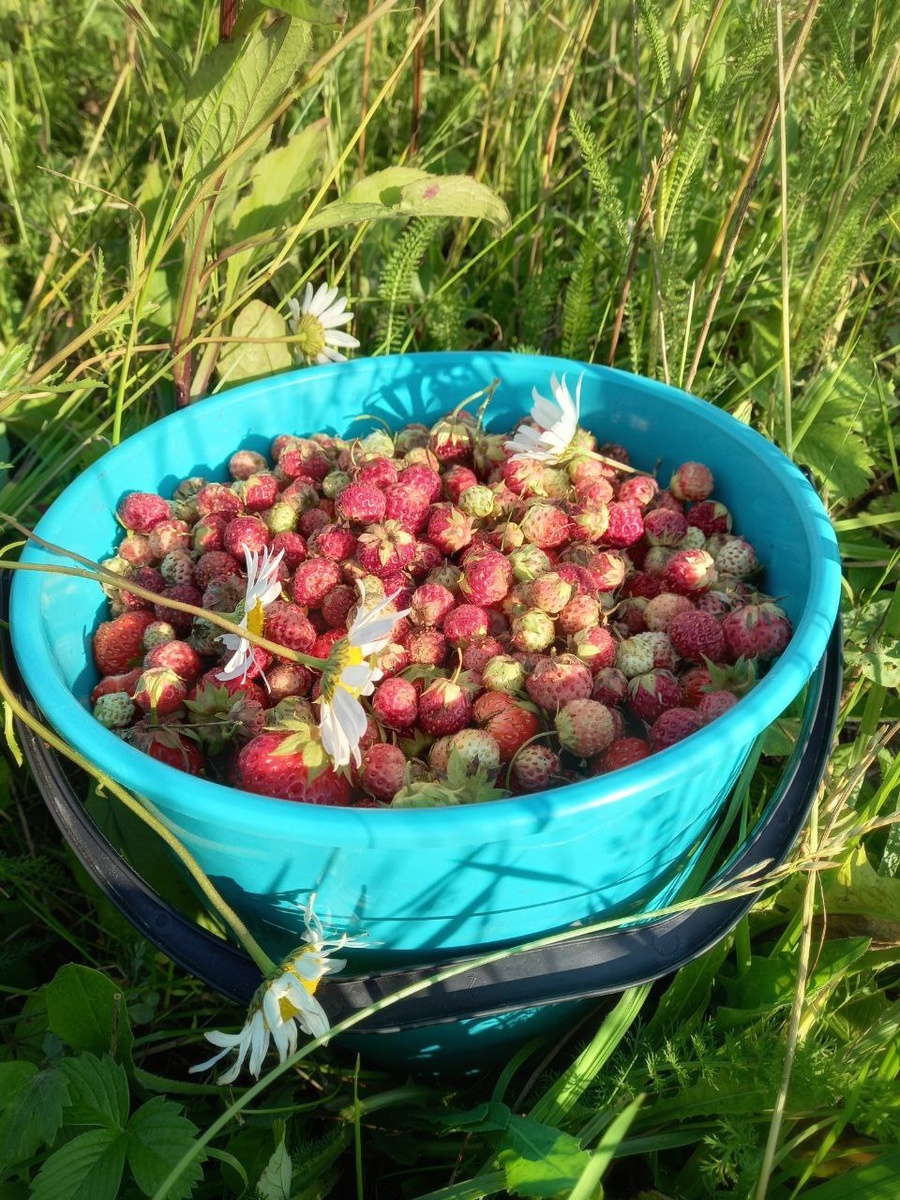 Вернулись с разведки с двумя майонезными ведёрками ягод и кучей всяких душистых трав. Решили немного позже приехать. Дней через десять ягоды появились. Литров восемь на двоих с дочкой набрали. Она собирала, а я больше бегала. Но в общем итоге у неё 4,5 литров ведро полное, у меня ведро такое же, но наполовину.
