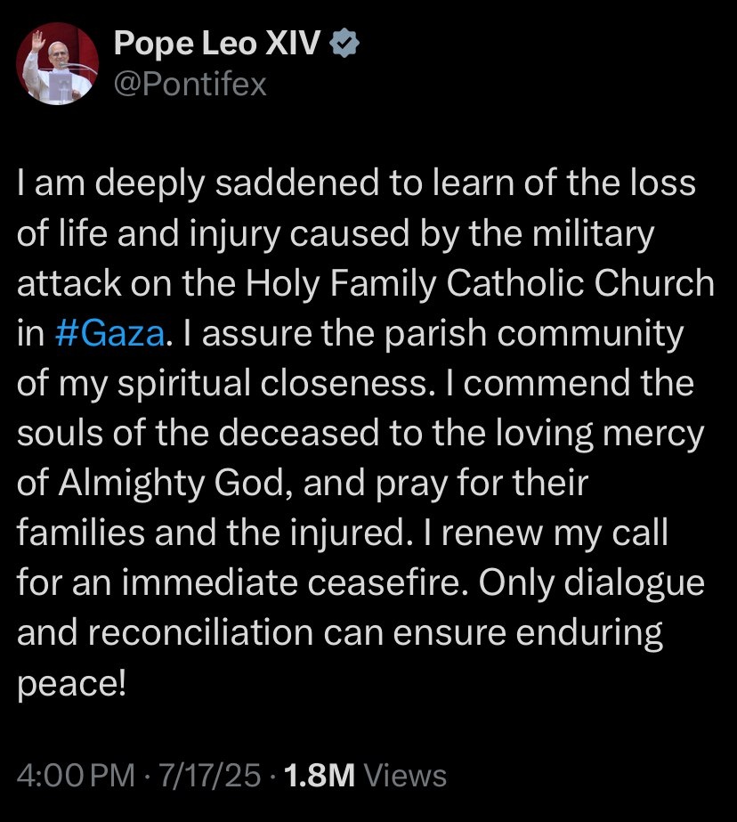 ‘Deeply saddened’ by ‘MILITARY ATTACK’ on Holy Family Catholic Church in Gaza — Pope Leo XIV, refraining from mentioning Israel Calls for ‘an immediate ceasefire’ ‘Only DIALOGUE and reconciliation can ensure enduring peace’