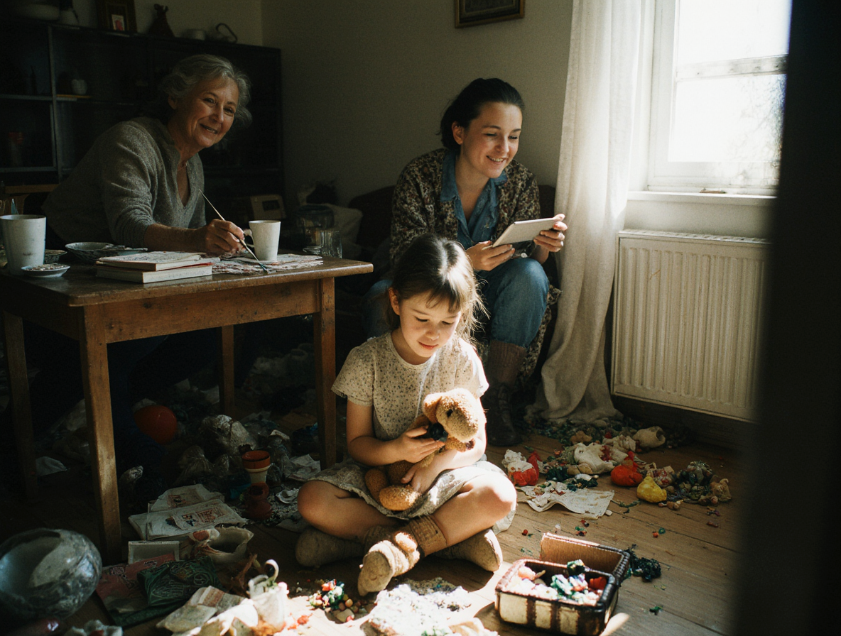 Маша села на пол в своей комнате, окружённая горой игрушек и книг. Всё это казалось ей сейчас одновременно знакомым и странным — будто части какого-то давно забытого мира. Она осторожно брала в руки плюшевого мишку, у которого один глаз чуть-чуть прищурился, и думала о том, как когда-то мама учила её не раскидывать вещи по комнате.