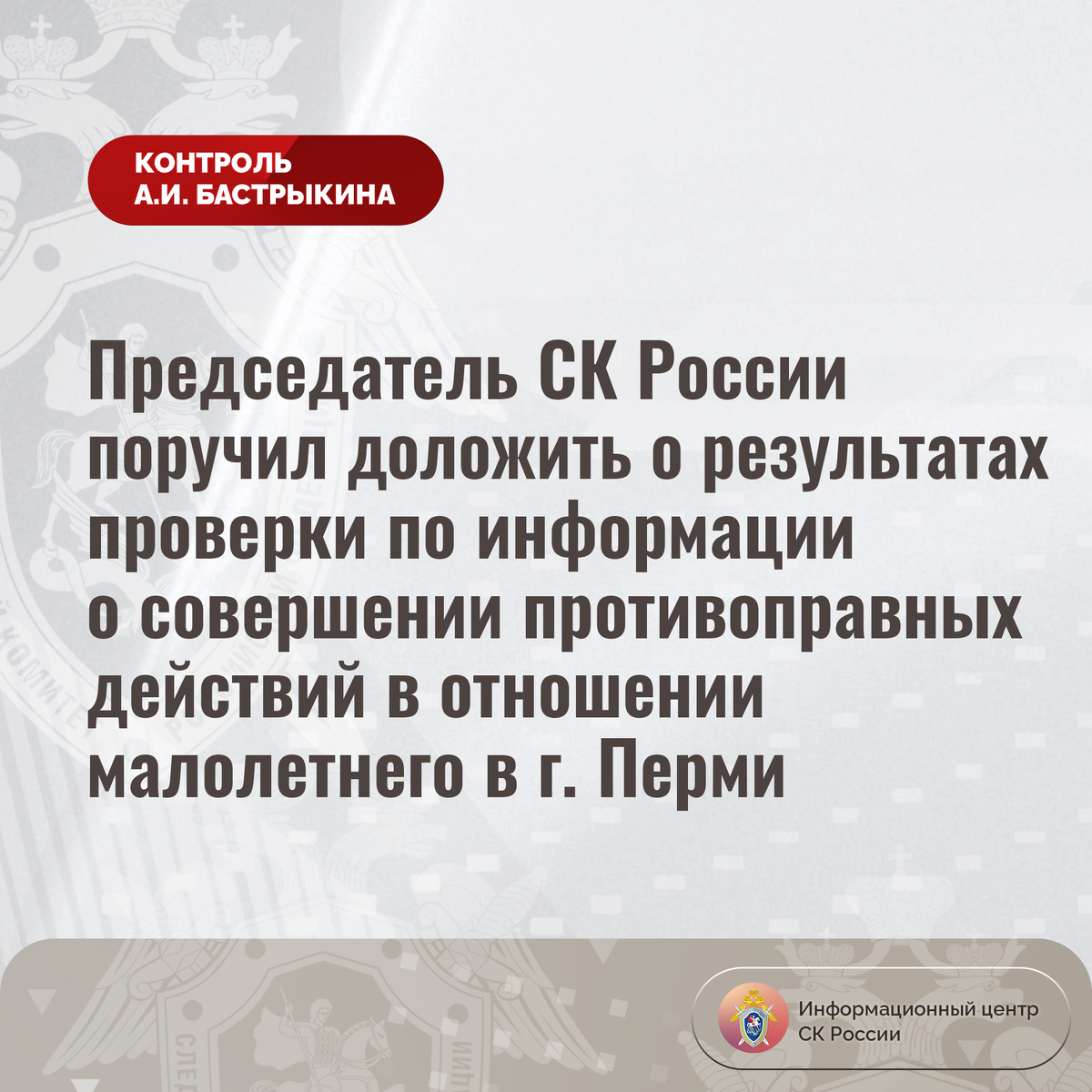 Председатель СК России поручил доложить о результатах проверки по информации о совершении противоправных действий в отношении малолетнего в г. Перми В эфире федерального телеканала сообщалось, что в городе Перми на протяжении года отчим систематически издевался над девятилетним мальчиком и избивал его. Кроме того, в марте текущего года мужчина, используя малозначительный повод, попытался утопить малолетнего. В результате ребенок сбежал из дома и обратился за помощью к прохожим. Отмечается, что мать ребенка, осведомленная о происходящем, мер реагирования не принимала. Ранее указанная ситуация освещалась в СМИ. А.И. Бастрыкин поручал представить по ней доклад. В СУ СК России по Пермскому краю расследовалось уголовное дело, которое направлено в суд для рассмотрения по существу. В настоящее время в региональном следственном управлении начата процессуальная проверка по ст. 156 УК РФ (неисполнение обязанностей по воспитанию несовершеннолетнего). Председатель Следственного комитета Российско