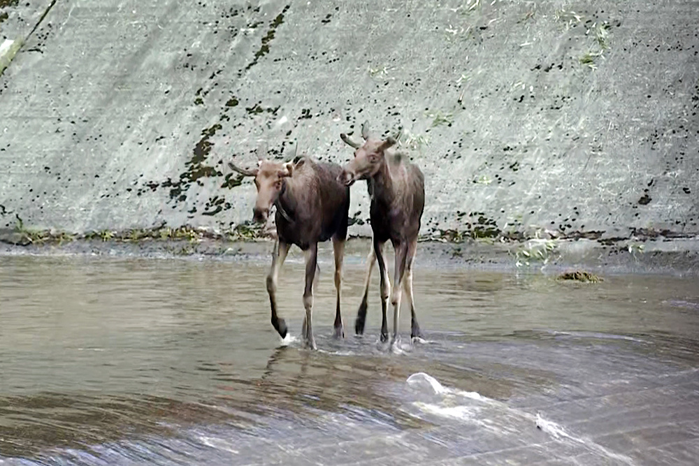 Спасатели спустились в участок водосброса. Одного из лосей, словно по водной горке, удалось спустить в реку, он уже поднялся на берег, в безопасном месте. Один из лосей всё еще остаётся на участке гидроузла.