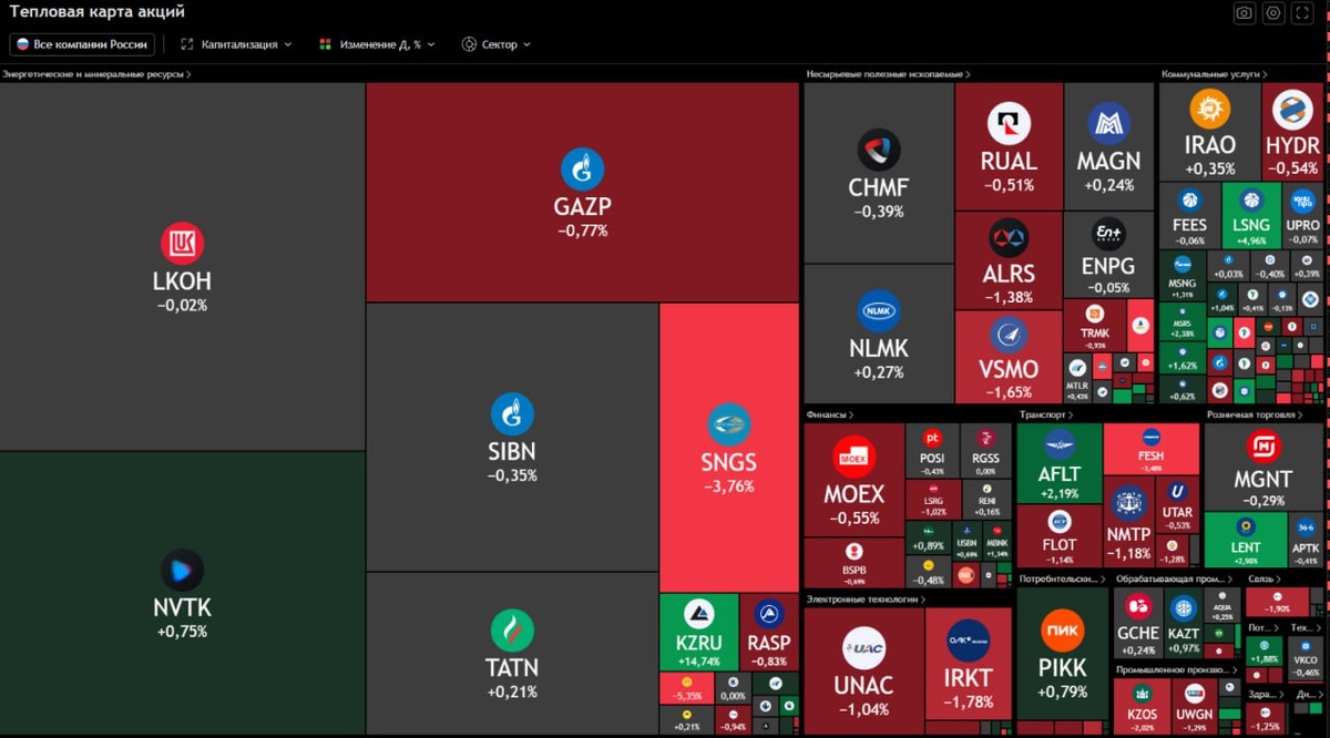 📣 Сбер испарился из тепловой карты индекса Мосбиржи после сегодняшнего пампа. Мир хвалит РФ за то, что мы победили инфляцию! Интересно сколько крепкий рубль еще продержится? ❗️ Россия одержала долгожданную победу в борьбе с инфляцией — BBG ❗️ ИНФЛЯЦИОННЫЕ ОЖИДАНИЯ НАСЕЛЕНИЯ РФ В ИЮЛЕ ОСТАЛИСЬ НА УРОВНЕ 13,0% - ОПРОС ЦБ 🏠 МОСКВА СЧИТАЕТ СЕБЯ ВПРАВЕ ПРИМЕНЯТЬ ОРУЖИЕ ПРОТИВ ВОЕННЫХ ОБЪЕКТОВ СТРАН, КОТОРЫЕ ПОЗВОЛЯЮТ КИЕВУ СВОИМ ВООРУЖЕНИЕМ БИТЬ ВГЛУБЬ РФ — МИД РФ — РИА 🏠 НАПАДЕНИЕ НА КАЛИНИНГРАДСКУЮ ОБЛАСТЬ ПРИВЕДЕТ К ОТВЕТНЫМ МЕРАМ, ПРЕДУСМОТРЕННЫМ ЯДЕРНОЙ ДОКТРИНОЙ РФ - СЛУЦКИЙ В ОТВЕТ НА СЛОВА ГЕНЕРАЛА США