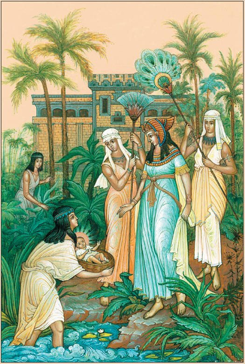 Провидение Божье использовало трех женщин, чтобы спасти маленького мальчика, который в назначенный час стал тем, кто вывел народ Божий из египетского рабства. В стихах 1-10 не названы имена ни одной из этих женщин. Рождение Моисея как бы окутано тайной. 1. Некто из племени Левиина пошел и взял себе жену из того же племени. 2. Жена зачала и родила сына и, видя, что он очень красив, скрывала его три месяца. (Книга Исход 2:1-2) Дальше в главах 6, 7, 15 Книги Исход мы узнаем имена и отца и матери, а также сестры и брата Моисея. очень красив - По выражению первомученика Стефана, он был «прекрасен пред Богом» (Деян. 7:20) ВИДЯ, что он очень красив или "увидела, что он хорош" – перекликается с первым рассказом о сотворении мира (ср. Быт 1: 4, 12, 18, 21, 25, 31; напр.: «И увидел Бог, что свет хорош, и отделил Бог свет от тьмы»). 3. но не могши долее скрывать его, взяла корзинку из тростника и осмолила ее асфальтом и смолою и, положив в нее младенца, поставила в тростнике у берега реки, 4. а с