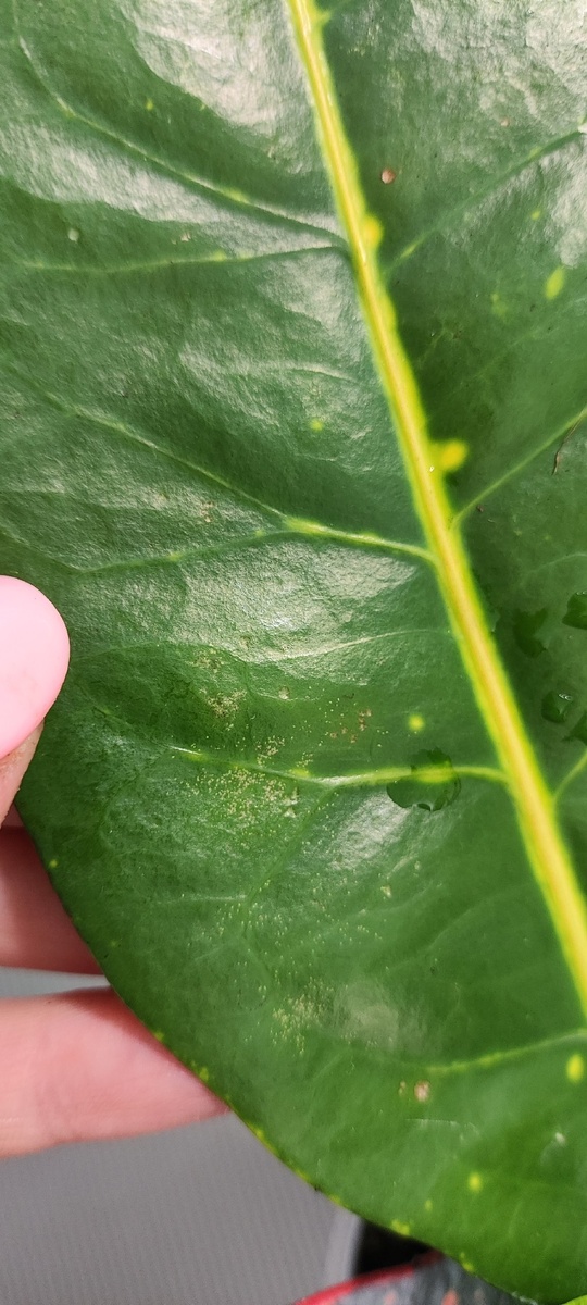 Добрый день! Скажите пожалуйста, что может быть с Кротоном? Купила в Пятёрочке, дома промыла зеленым мылом, посадила в хороший грунт, а сейчас увидела такие пятнышки на поверхности листьев ((( Его кто-то ест? 😭