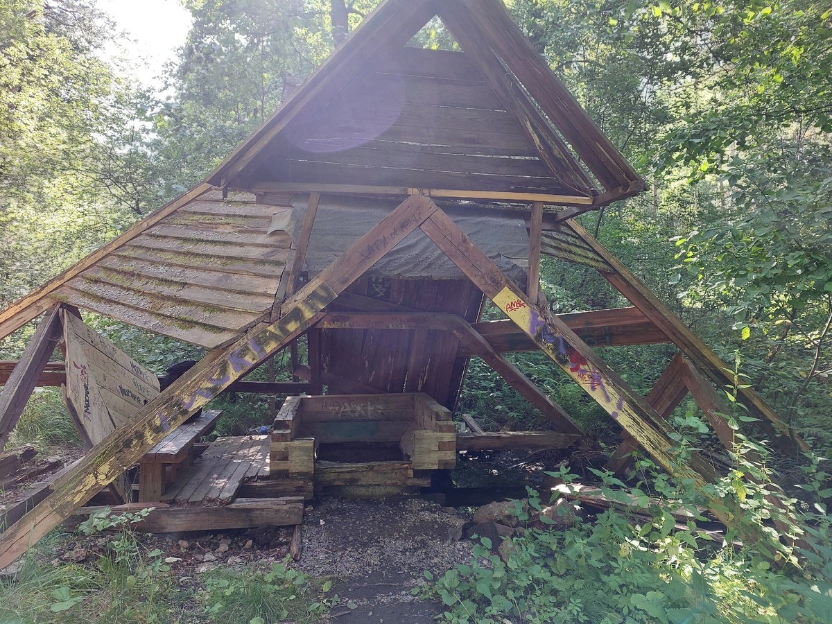 Беседка на роднике. Строение ставили в 90-ых, когда денег не было от слова совсем. Сейчас вроде бы всё иначе. Может вместо установки очередного снежика восстановить/заменить сооружение. На мой взгляд гораздо более рациональное расходование средств.