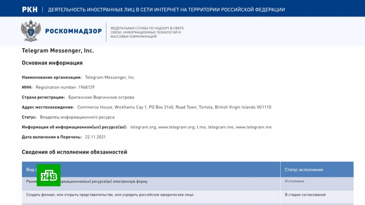 [ Смотреть видео на сайте НТВ ] Руководство мессенджера Telegram занялось открытием представительства в РФ, сообщили в Роскомнадзоре. Судя по информации на сайте РКН, сейчас Telegram находится на стадии согласования обязанностей по закону о «приземлении». Он подразумевает создание филиала компании, открытие представительства или учреждение российского юрлица. Telegram состоит в перечне РКН с 22 ноября 2021 года. За это время он разместил на информационном ресурсе специальную электронную форму и зарегистрировал личный кабинет на сайте службы. [ Смотреть видео на сайте НТВ ]