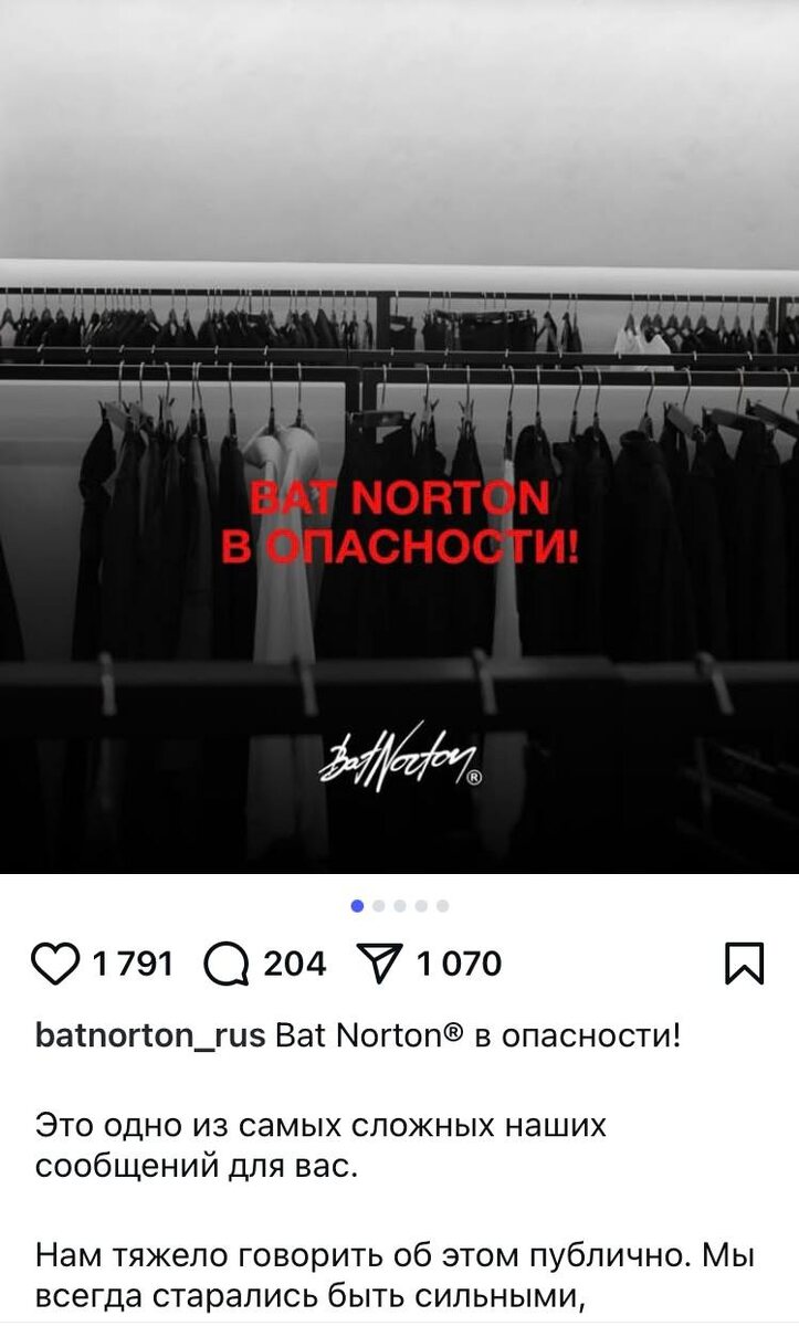 Bat Norton под угрозой закрытия. Еще один маленький локальный бренд, питерский Bat Norton пишет, что поток людей в ТЦ, где они находятся, упал в 3-4 раза, а их выручка - на 40%, они закрывают точки продаж и режут косты, но денег не хватает на текущие обязательства. Объявили акцию -20% на все и просят подписчиков о помощи. @make_your_style