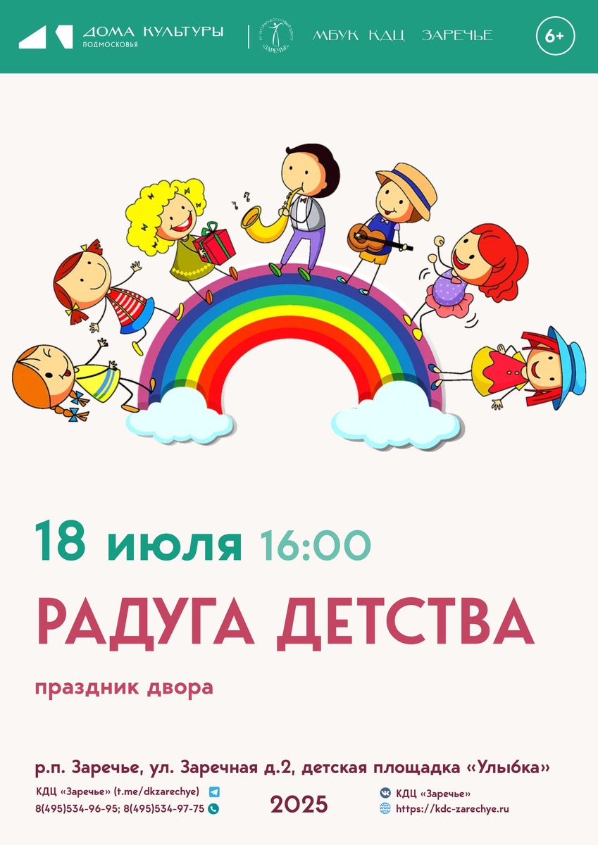 Друзья! Ждем вас завтра на нашем ПРАЗДНИКЕ ДВОРА "Радуга детства"! 🌈 В программе - веселые эстафеты, подвижные игры и танцы! ⛹♀️🏸💃 А если вы придете пораньше, то сможете принять участие в МАСТЕР-КЛАССЕ "Руки не для скуки"! 🎨 Скучать вам точно не придется! Начало МАСТЕР-КЛАССА в 15:00 Начало ПРАЗДНИКА - в 16:00 До скорой встречи! #кдцзаречье #культура_одинцовскийгородскойокруг #культуравзаречье #культура #ОГО #культураОГО #праздникдвора #культканикулы