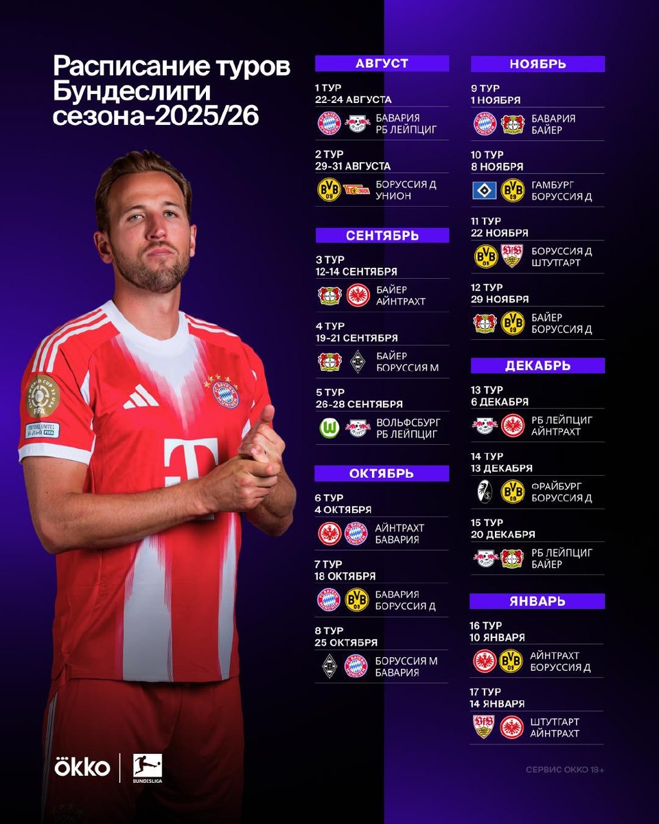 Чуть больше месяца до старта Бундеслиги! Показываем расписание туров в сезоне-2025/26 🇩🇪 В матче-открытии «Бавария» сыграет против «РБ Лейцпиг». Также добавили главные матчи туров. Подробное время и дата игр пока что доступны до конца сентября. 🔥 — если будешь смотреть Бундеслигу в Okko!