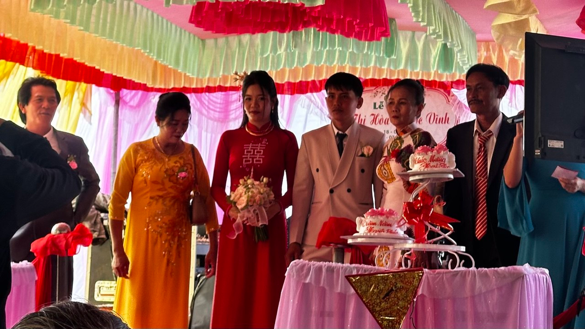 На сцене жених с невестой разрезают торт, который потом унесли, и не дали попробовать гостям! Делают они это просто для галочки, ждут пока их снимет фотограф. После этого молодожены разливали шампанское, которое также как и торт, было для вида и фотографии. После этого была речь родителей со стороны жениха и невесты, но в силу незнания вьетнамского языка не могу поведать о чем они говорили. В завершении певица исполнила пару песен.