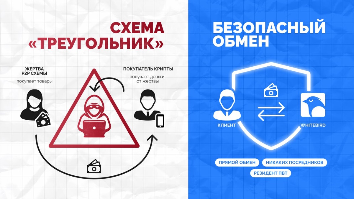 👀 Участились случаи применения мошеннических схем при P2P обмене — теперь это реальная угроза для безопасности! Один из наиболее популярных методов обмана при обмене на P2P площадках — схема "Треугольник". Как это работает: • Мошенник собирает деньги с жертв под видом продажи товаров или оказания услуг • Переводит их Вам на карту за криптовалюту • Исчезает с Вашей криптой • Жертвы требуют деньги с ВАС Результат: высокая вероятность возбуждения уголовного дела + перманентная блокировка карт Решение: WHITEBIRD — легальный обмен без рисков не только в Беларуси! ✅ Резидент ПВТ ✅ Прямой обмен без посредников ✅ Никаких мошеннических схем ✅ Обменник | Биржа | Обратиться в техническую поддержку