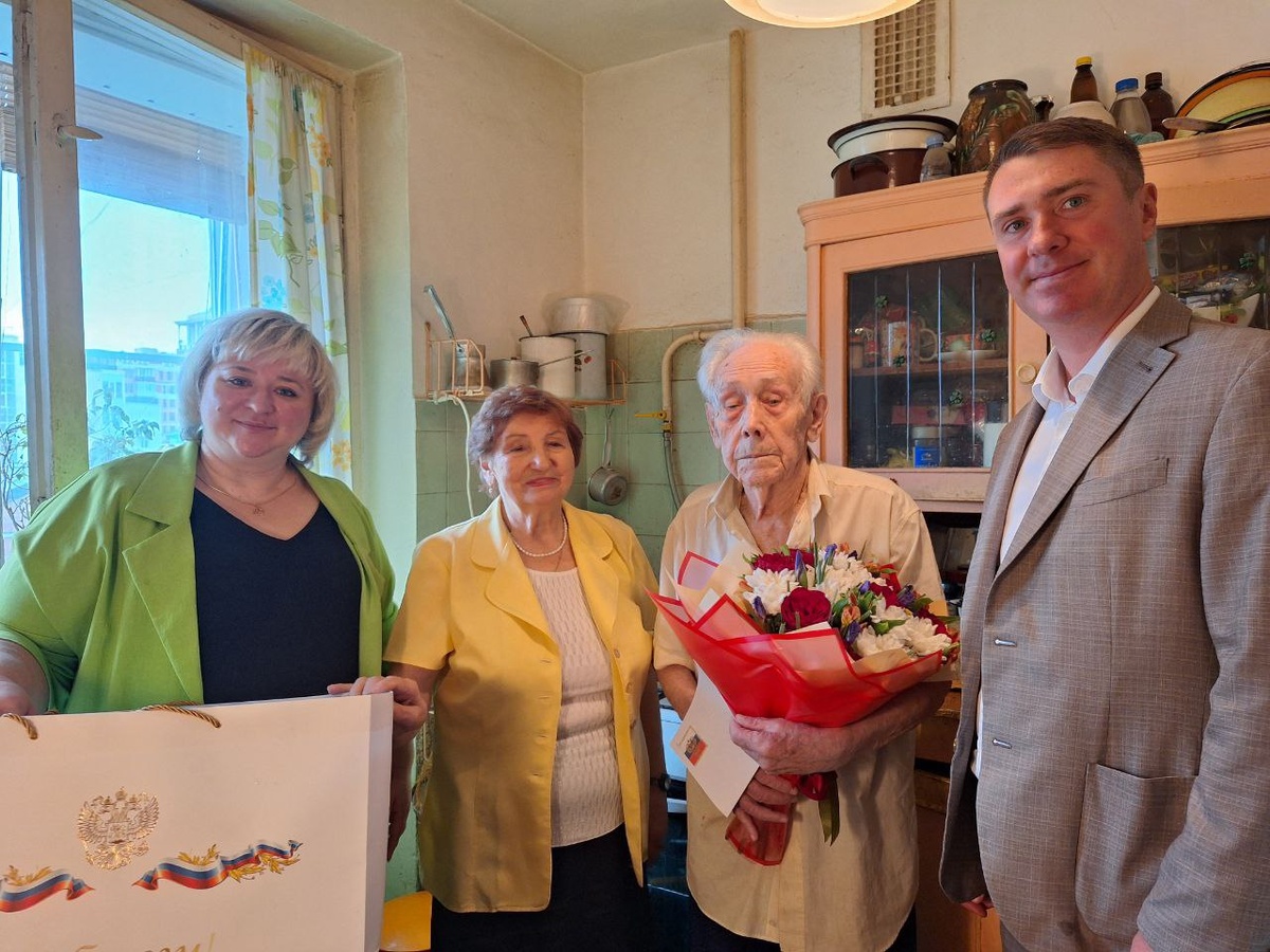 С почётной миссией побывали в гостях у ветерана Великой Отечественной войны Фёдора Васильевича Зеленова. Сегодня ему исполнилось 100 лет. Для меня было большой честью лично поздравить юбиляра с таким значимым событием. Вместе с главой муниципального округа Надеждой Толмачевой и председателем Совета ветеранов Валентиной Шурыгиной мы вручили юбиляру письмо с поздравлением от Президента Российской Федерации, цветы и памятный подарок. Федор Васильевич — ветеран Великой Отечественной войны и труженик тыла. Он удостоен девяти наград, среди которых медаль «За доблестный труд в Великой Отечественной войне 1941–1945 гг». Уважаемый Федор Васильевич! От всей души поздравляю Вас с юбилеем! Вы вдохновляете своей силой духа и стойкостью, являясь примером для многих поколений. Желаю Вам здоровья, благополучия и заботы со стороны близких! Пусть каждый Ваш день будет наполнен теплом и вниманием!