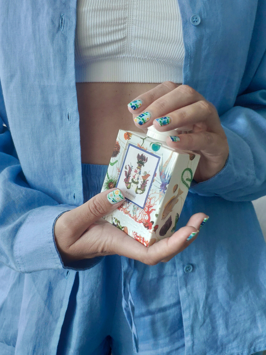 Снова залезла в A'mmare Carthusia, до чего красивые духи! Пахнут морем и спёкшимися на солнце водорослями, соляными разводами на коже, смешанными с остатками санскринового крема, пломбиром в вафельном стаканчике, цветами и белоснежным песком. Казалось бы, классический тандем отпускных нот, за последние три года ароматов с таким набором выпустили легион. Но в A'mmare всё это пронизано пряным духом ароматных трав, тимьяном, розмарином, мятой, чабрецом и так далее, по крайней мере, я чувствую целый огородный букет. Здесь будто смешались два жанра, санскриновый белоцветочный и зелёный ароматический, и это уже совсем другое дело. Композиция получилась крайне необычной. Подобные духи мгновенно выдергивают тебя из привычного, полного суеты и проблем бытия, перенося в ленивое отпускное межвременье. Рада, что когда-то клюнула на этот дивный флакон, расписанный яркими иллюстрациями морских обитателей авторства художницы Паолы Тассетти. Внутри всё также прекрасно! И особенно приятно мысленно в