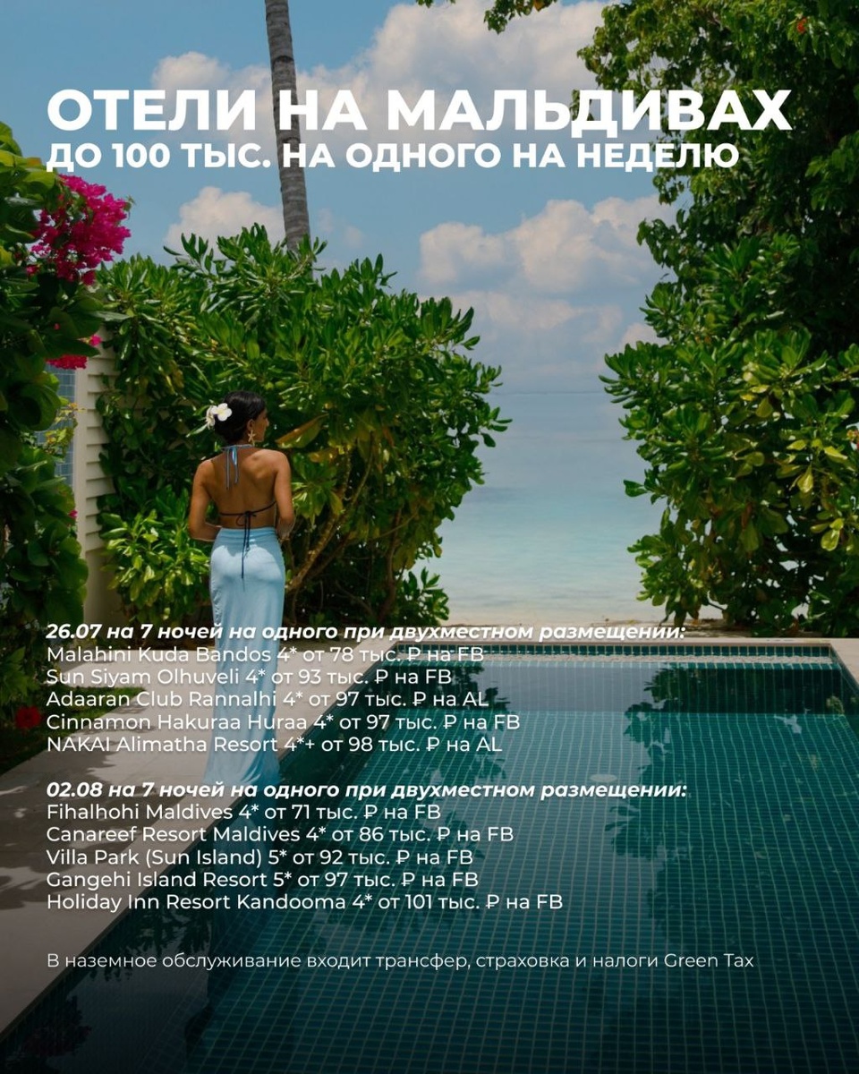 ⭐️ Отели на Мальдивах до 100 тыс. на одного на неделю 😱 Половина лета уже за плечами, поэтому спешите выбрать отдых на Мальдивах по доступным ценам! ⭐️ 26.07 на 7 ночей на одного при двухместном размещении: 🐚 Malahini Kuda Bandos 4* от 78 тыс. ₽ на FB (полный пансион) 🐟 Sun Siyam Olhuveli 4* от 93 тыс. ₽ на FB (полный пансион) 🐢 Adaaran Club Rannalhi 4* от 97 тыс. ₽ на AL (все включено) 🏄♀️ Cinnamon Hakuraa Huraa 4* от 97 тыс. ₽ на FB (полный пансион) 🪸 NAKAI Alimatha Resort 4*+ от 98 тыс. ₽ на AL (все включено) ⭐️ 02.08 на 7 ночей на одного при двухместном размещении: 🐚 Fihalhohi Maldives 4* от 71 тыс. ₽ на FB ( полный пансион) 🐟 Canareef Resort Maldives 4* от 86 тыс. ₽ на FB (полный пансион) 🐢 Villa Park (Sun Island) 5* от 92 тыс. ₽ на FB (полный пансион) 🪸 Gangehi Island Resort 5* от 97 тыс. ₽ на FB (полный пансион) 💙Holiday Inn Resort Kandooma 4* от 101 тыс. ₽ на FB (полный пансион) *Наличие актуально на момент публикации! В наземное обслуживание входит трансфер,