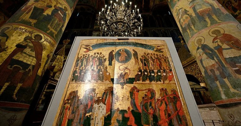 Один из древнейших памятников русской иконописи вернулся в Успенский собор Московского Кремля. Завершилась почти девятилетняя реставрация иконы «Страшный суд» — уникального памятника конца XIV — начала XV века. Как уточнила генеральный директор Музеев Московского Кремля Елена Гагарина, последний раз икону реставрировали в 1920-х годах. С 2016 года за ее судьбу отвечала ведущий художник-реставратор Лариса Гущина. Девять лет работы, колоссальное внимание к мельчайшим деталям, современные технологии — результат наконец можно увидеть собственными глазами. Во время реставрации специалисты не просто чистили и укрепляли красочный слой, но и провели целый ряд исследований — в инфракрасном и рентгеновском спектре. В итоге выяснилось, что в глубинах иконы скрывались неизвестные фрагменты живописи. «Страшный суд» оказался не таким уж изученным — даже спустя шесть веков ему есть чем удивить. Художник-реставратор Елена Юдина подчеркнула, что все решения принимались исключительно коллегиально — на р
