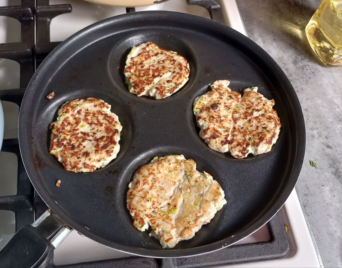 #драники из кабачков с фаршем индейки #новый рецепт Ингредиенты Кабачки молодые 400-500 г Фарш индейки 400-500 г Творожный/сливочный сыр - 100-150 г Сметана 1 ст.л. Яйца куриные 1 шт. Рисовая манка/Манная крупа 3-4 ст.л. Зелень укропа по вкусу Чеснок 3 крупных зубца Соль по вкусу Приготовление: 1. Моем кабачок и натираем его на терке вместе с кожурой. Даем постоять чтобы кабачки пустили лишний сок. 2. Хорошо отжимаем натертый кабачок через салфетку и выкладываем в миску. 3. Добавляем к тертому кабачку творожный сыр, сметану, яйцо, нарубленный укроп, натертый чеснок и фарш. Размешиваем. 4. Далее в эту массу добавляем рисовую манку и солим по вкусу. Хорошо перемешиваем и даем постоять минут 10 для набухания манки. 5. Сковороду смазываем растительным маслом и разогреваем ее. 6. Ложкой выкладываем на сковороду нашу кабачковую смесь. Обжариваем до готовности на среднем огне с обеих сторон. Внук оценил 👍👍👍 #нюансы Очень удобно оказалось жарить драники на сковороде для оладьев с