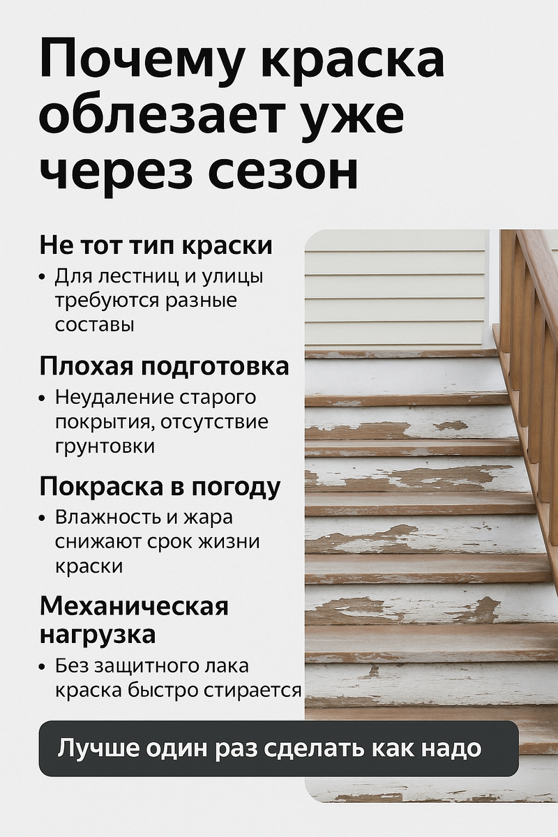 Почему краска облезает уже через сезон: главные ошибки и как их избежать 🎨 Вы только что покрасили лестницу, а уже следующей весной покрытие начинает шелушиться и сыпаться? Знакомо? Давайте разберёмся, почему так происходит — и как этого избежать раз и навсегда. 🔍 Причина №1: не тот тип краски Большая часть проблем — в неправильном выборе. Покрасить лестницу «тем, что осталось после забора» — не лучшая идея. Уличные и внутренние лестницы требуют разных составов: Решение: всегда выбирайте специализированные составы — например, полиуретановые, алкидные или акриловые краски, предназначенные именно для лестниц. 🧽 Причина №2: плохая подготовка поверхности Даже самая дорогая краска не спасёт, если: Без этого краска просто не держится — особенно на металле, где малейшая ржавчина под краской превращается в «пузырь» уже через пару месяцев. Решение: грунтовка + антикоррозийный состав (для металла) или морилка (для дерева) обязательны. 🌧 Причина №3: покраска «не в ту погоду» Удивительно,
