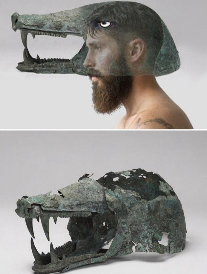 Бронзовый шлем в виде головы волка или кабана. Этрурия, VI-V века до нашей эры. Воевать в таком шлеме не предполагалось, он был создан для различных церемоний. Собственно, он так сильно разрушен как раз из-за небольшой толщины металла. И клыков изначально не было. Это уже новодел XIX века. #truehistory