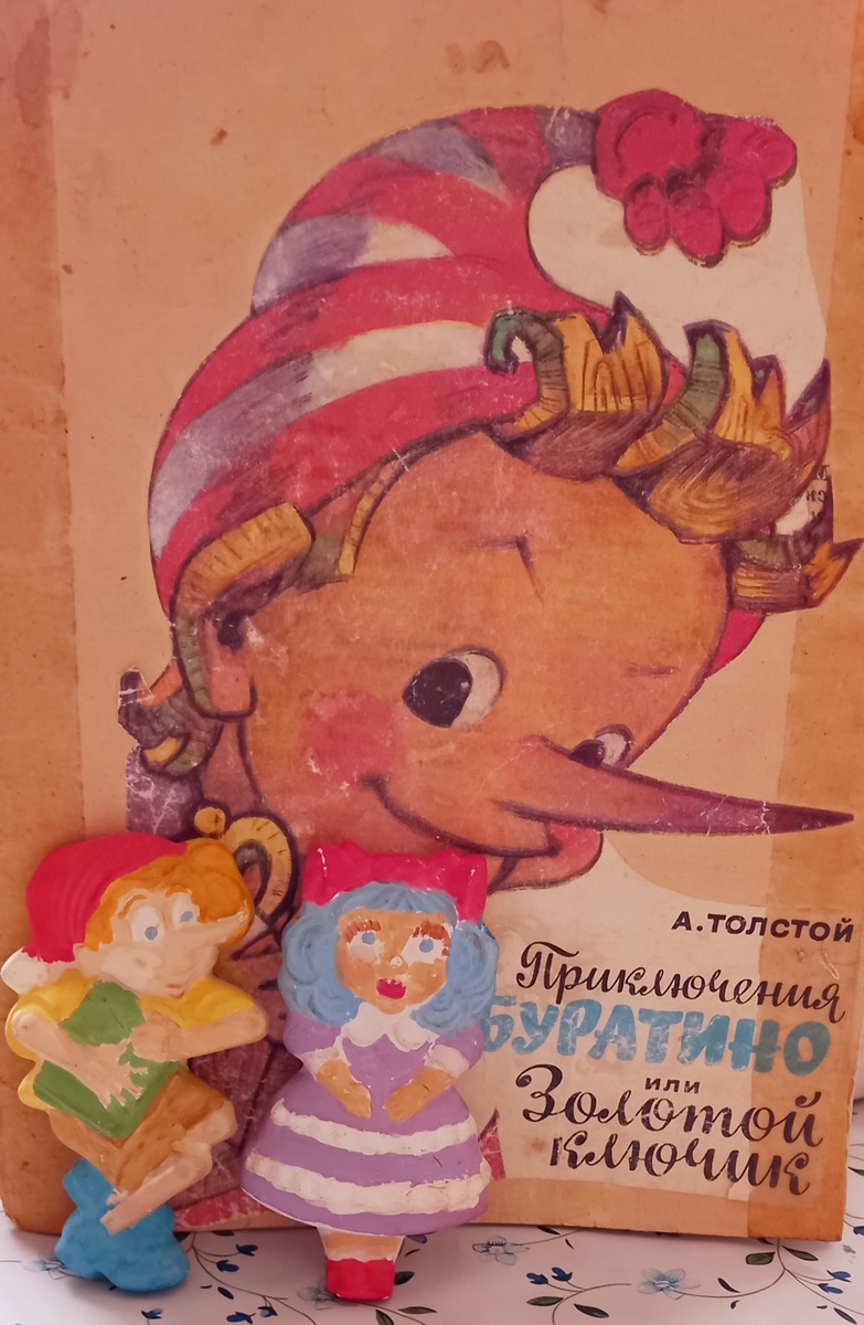 Ура! Ура! Ура! Фотопроект "Литературные куклы" снова здесь. Напомню, что цели проекта - вызвать интерес к старым добрым бумажным книгам. А ещё вспомнить любимые книги моего детства и юности и книги, которые читали мои родители, когда они сами были ещё маленькими или когда им было столько же лет, сколько мне сейчас. А также поведать моим подписчикам и просто посетителям этой странички о книгах, которые они, возможно, ещё не читали. И напомнить им о книгах, которые они читали в дошкольные и школьные годы. В проекте - книга Алексея Николаевича Толстого "Золотой ключик или Приключения Буратино". И гипсовые куклы, изображающие героев этой сказки. Кукол Буратино и Мальвину я раскрашивала сама. Они оба из набора для творчества. Эти куклы со мной с 2005 г. А книга эта старше меня. Она была напечатана в издательстве "Студия детской книги" "Советского фонда милосердия и здоровья" в 1991 г. То, что книга "Золотой ключик или Приключения Буратино" появилась в моём фотопроекте сегодня, - не сл