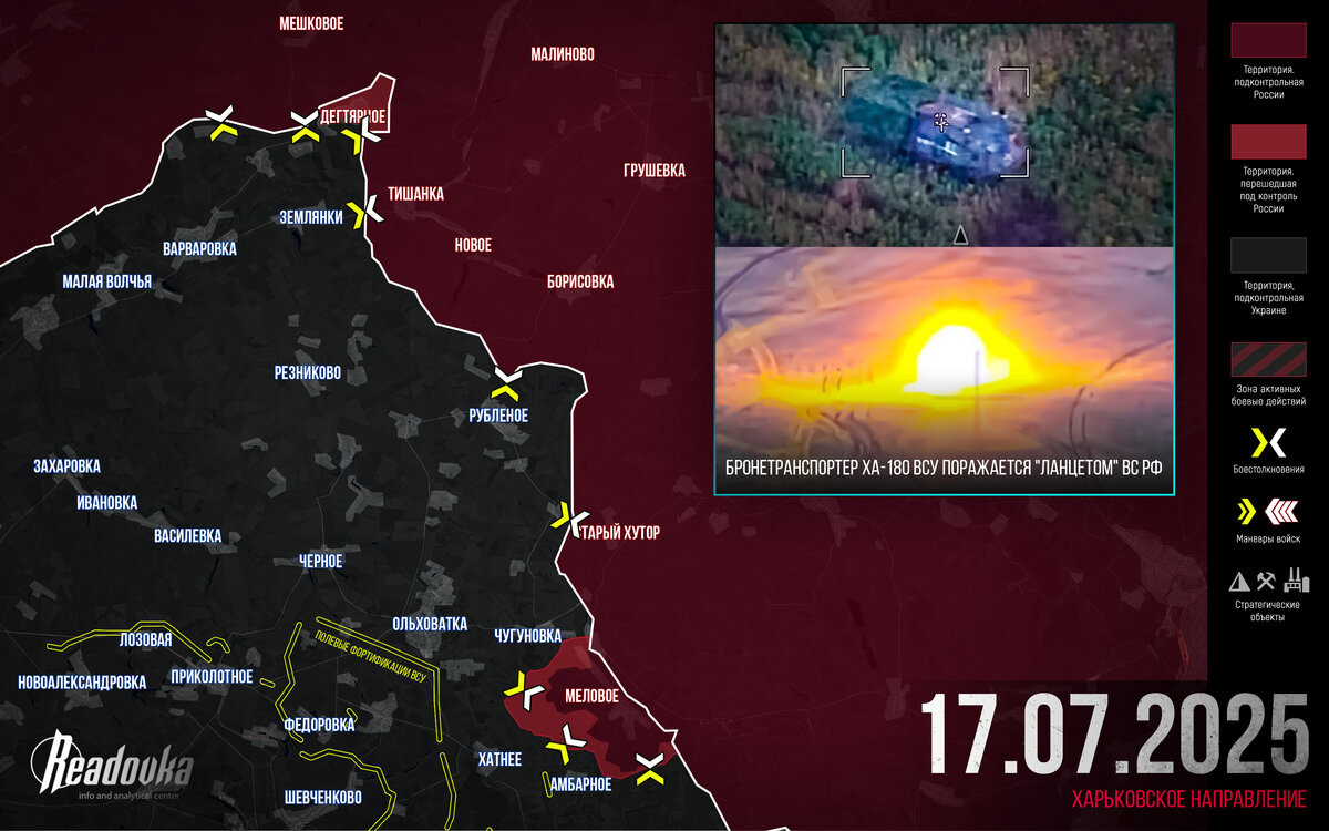 Редакция Readovka собрала самые важные события 17 июля в разрезе СВО. Русские войска начали создавать буферную зону по реке Волчья в Харьковской области. Стало известно о бойце ВС РФ с позывным «Ростов», который в составе 68-й ОРБ на Покровском направлении сумел за 3 часа уничтожить 6 единиц бронетехники противника. На Украине на одном из полигонов подготовки пополнения для ВСУ насильно мобилизованный расстрелял двух инструкторов..