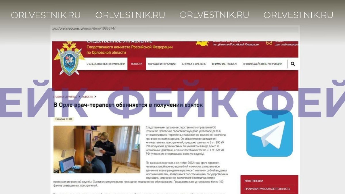 В Орле фейки добрались до следкома Фейковый скриншот официального сайта СУ СК России по Орловской области о липовом возбуждении уголовного дела в отношении главы военно-врачебной комиссии за взятки от родственников госслужащих распространяется через крупные городские телеграм-каналы. https://orlvestnik.ru/news/v-orle-fejki-dobralis-do-sledkoma ✅ Подпишись на "ОВ" 📩 Прислать новость #Орловский_вестник #стройка #Орловская_область #Орел