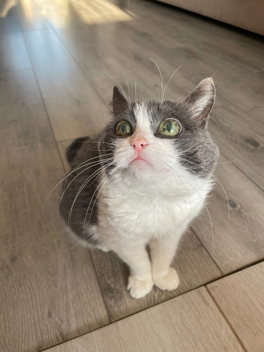 Сердце сжимается каждый раз, когда я вспоминаю тот день. 28 октября 2023 года. Не просто дата – рубеж. Грань между небытием и... вот этим чудом, что тихонько мурчит сейчас рядом. Пингвинчик. Пингви. До сих пор слышу этот крик. Не мяуканье, нет. Это был вопль чистого, животного ужаса, вырывающийся из самой глубины маленького, перепуганного существа. Звук, который леденит душу. Я подошла... и обомлела. Картина, от которой кровь стынет: три собаки. Две – огромные, терпеливые, знающие свое дело хищники, перекрывающие выходы. А третья самая маленькая лезла под тот самый ларек, в последнюю щель, где ты забилась. Организованная облава. На кошечку. "Выкуривали"... Вот точное слово. Вытащила тебя. Дрожащий, мокрый от страха комочек шерсти и косточек. Глаза – два огромных черных озера ужаса. Тогда я и подумать не могла, что этот искалеченный судьбой зверек станет таким... таким светом. Таким Пингвинчиком. Оглядываюсь сейчас, смотрю на тебя – и задаюсь вопросами. Где ты была? Как жила? Что тебе