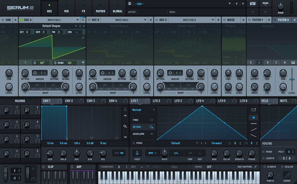Для мощного саба лучше всего взять синусоиду. В Serum есть стандартные формы — выберите Basic Shapes и поставьте волну в первый (OSC1) и второй (OSC2) осциллятор. 2. Настройка фазы