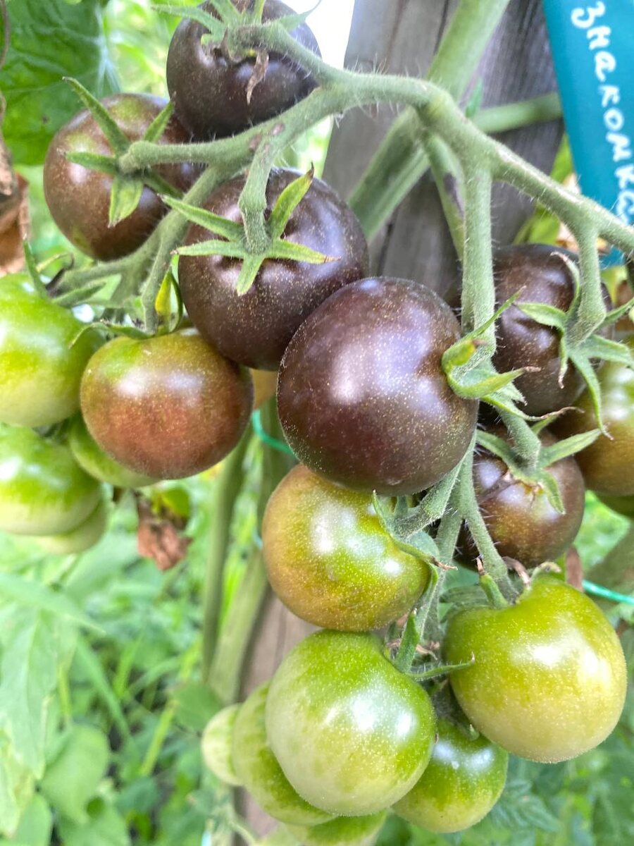 Очень необычный сорт Незнакомка. Интересно наблюдать за процессом созревания. Сначала были шикарные длинные кисти зеленых круглых плодов, чуть крупнее черешни. Сейчас плоды окрашиваются в пурпурно фиолетовый цвет. Красивое зрелище!