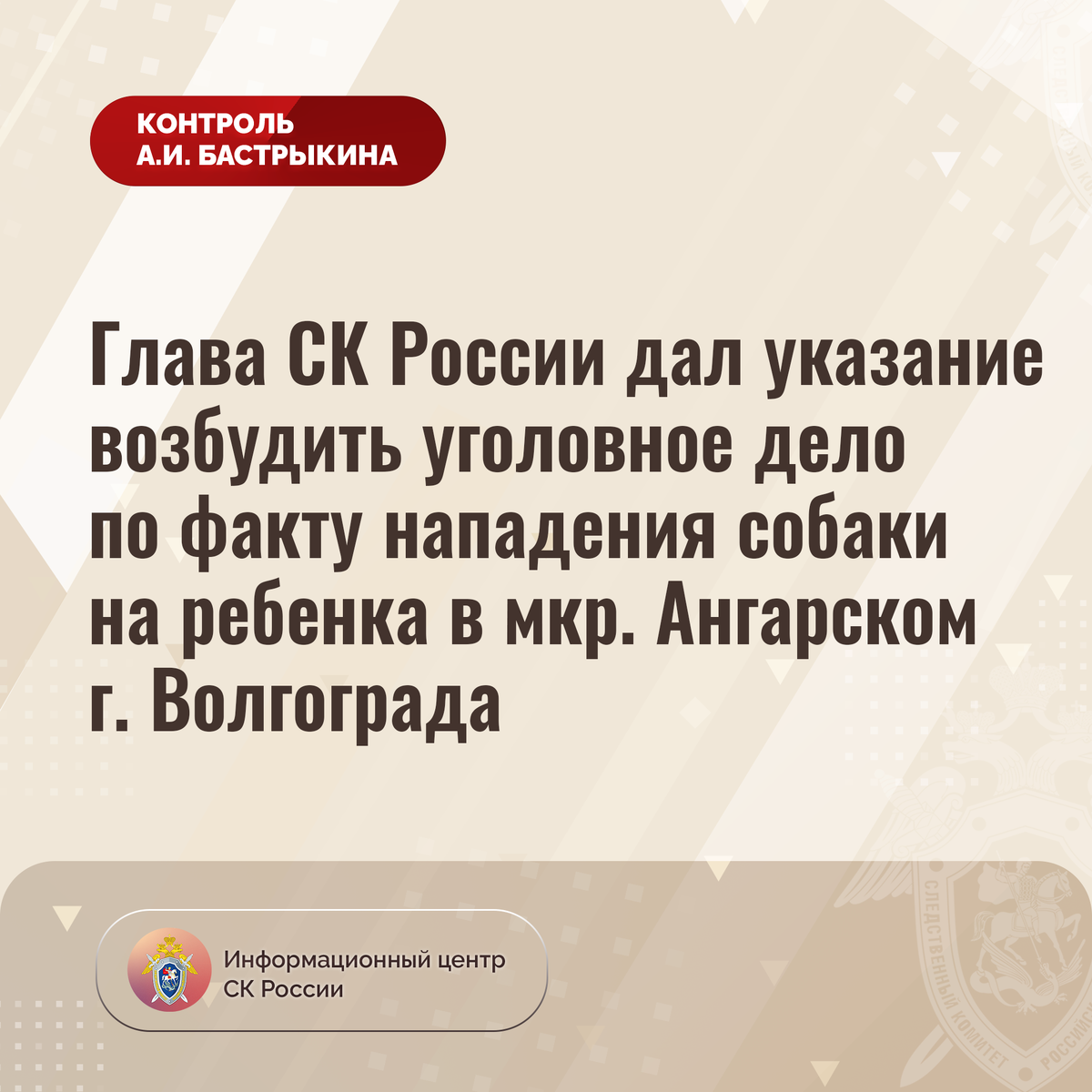 Глава СК России дал указание возбудить уголовное дело по факту нападения собаки на ребенка в мкр. Ангарском г. Волгограда В СМИ сообщается, что в июле текущего года в микрорайоне Ангарском города Волгограда агрессивная собака, находившаяся на самовыгуле без намордника, набросилась на девочку, укусив за ногу. Пострадавшей потребовалась медицинская помощь. Отмечается, что ранее то же животное совершило аналогичное нападение на мальчика. Обращения родителей пострадавших детей в компетентные органы результатов не принесли. СУ СК России по Волгоградской области инициировало вопрос о передаче материалов процессуальной проверки по данному факту из органов внутренних дел в свое производство. Председатель Следственного комитета Российской Федерации Александр Иванович Бастрыкин дал указание руководителю СУ СК России по Волгоградской области Василию Ивановичу Семенову возбудить уголовное дело и представить доклад о ходе и результатах его расследования. Исполнение поручения поставлено на контроль