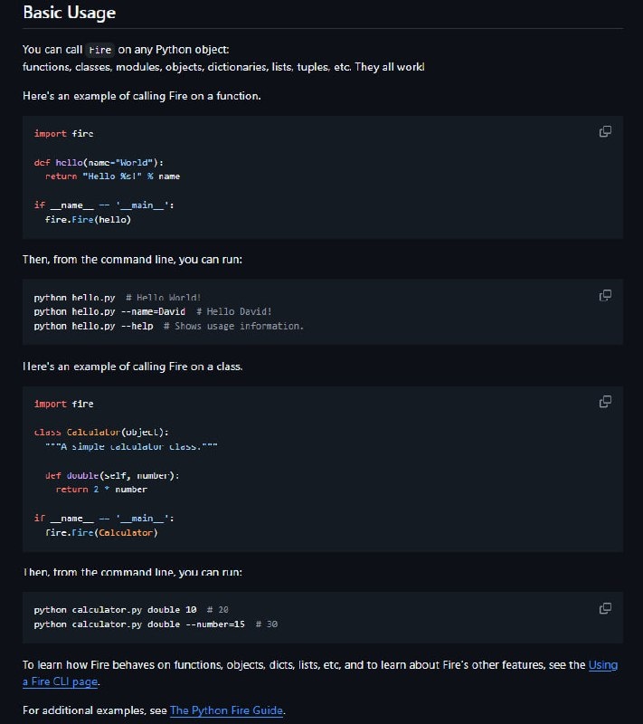 π₯ Python Fire β ΡΡΠΎ Python-Π±ΠΈΠ±Π»ΠΈΠΎΡΠ΅ΠΊΠ°, ΠΏΡΠ΅Π΄Π½Π°Π·Π½Π°ΡΠ΅Π½Π½Π°Ρ Π΄Π»Ρ Π°Π²ΡΠΎΠΌΠ°ΡΠΈΡΠ΅ΡΠΊΠΎΠΉ Π³Π΅Π½Π΅ΡΠ°ΡΠΈΠΈ ΠΈΠ½ΡΠ΅ΡΡΠ΅ΠΉΡΠΎΠ² ΠΊΠΎΠΌΠ°Π½Π΄Π½ΠΎΠΉ ΡΡΡΠΎΠΊΠΈ (CLI) ΠΈΠ· Π»ΡΠ±ΡΡ