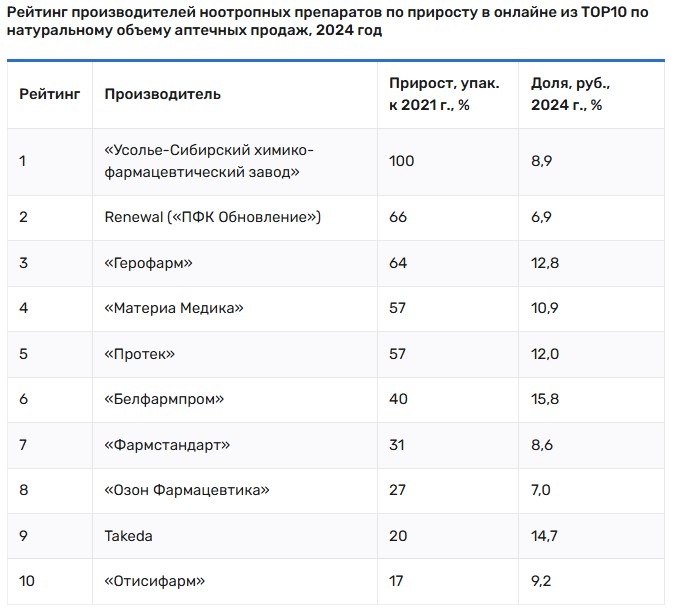 Меня удивили полученные результаты поиска на данный вопрос. Здравствуйте. Я врач-невролог Батенькова Татьяна Юрьевна. Углубленно занимаюсь темой инсульта. В данном блоге все про головной мозг и инсульт. Подпишитесь За 2024 год аптеки реализовали 44,9 млн упак. ноотропных препаратов общей стоимостью 29,7 млрд руб., следует из данных Ежемесячного розничного аудита фармацевтического рынка России компании DSM Group. Рейтинг производителей ноотропных препаратов по продаже онлайн - Вы можете увидеть на фото. В статье от 2017, в журнале ВАК отмечено, что актовегин один из ТОП -препаратов, назначаемых в рамках нейропротекции. И есть одно обобщенное исследование от 2012г г. Тверь, где проводили исследование "частота применения ноотропов после острого НМК" - победитель пирацетам. Спасибо, что дочитали данную статью до конца. Жду Вас в данном блоге.