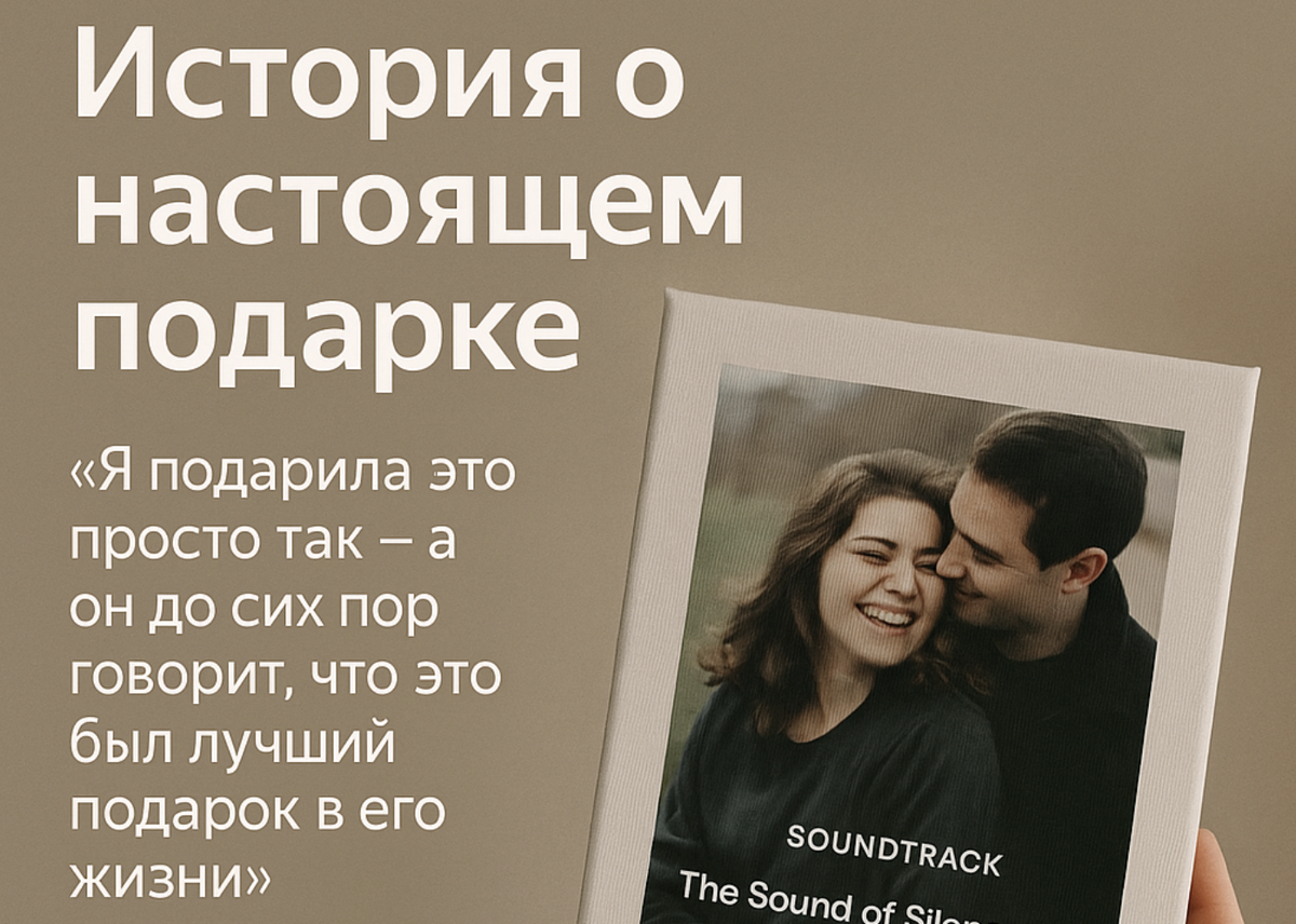 ✍️ Рассказ от Елизаветы, контент-редактора Podarki.ru Мы тогда встречались всего пару месяцев. Всё было легко, без громких слов и обещаний. Я не знала, что подарить — не тот случай, когда хочется дарить серьёзные вещи, но и ерунду не хотелось. Случайно наткнулась на идею — холст с фотографией и названием песни. Выглядит как обложка альбома, только с твоим снимком и треком, который ты выбираешь сам. И тут я вспомнила: как-то он в машине поставил старую песню. Ничего особенного, но он сказал: «Когда я её слышу — как будто возвращаюсь в нормальное состояние. Это мой антистресс.» Я запомнила. Просто потому что он редко делится такими штуками. Нашла нашу общую фотографию — с прогулки, не совсем в фокусе, зато настоящую. Заказала холст. Без подписи. Без открытки. Просто сама идея — фото и та самая песня. Когда он открыл коробку, он ничего не сказал. Просто смотрел. А потом тихо выдал: «Ты что, серьёзно это сделала?..» И поставил в спальне. Сейчас мы уже больше года вместе. Иногда он включа
