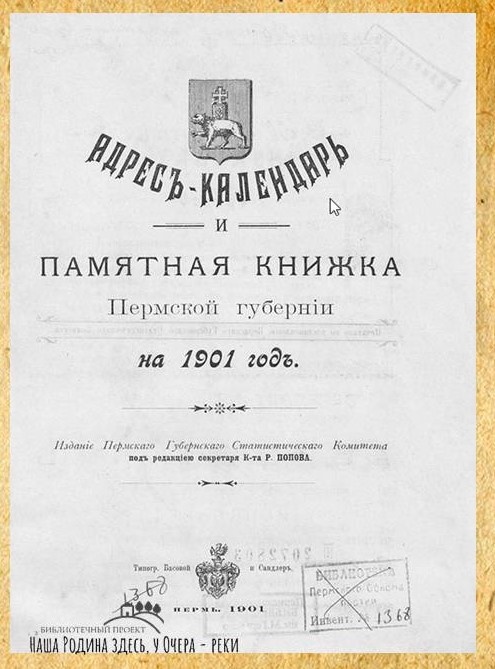 Источник: Адрес-календарь и памятная книжка Пермской губернии на 1901 год. Издание Пермского губернского статистического комитета под редакцией секретаря комитета Р. Попова.