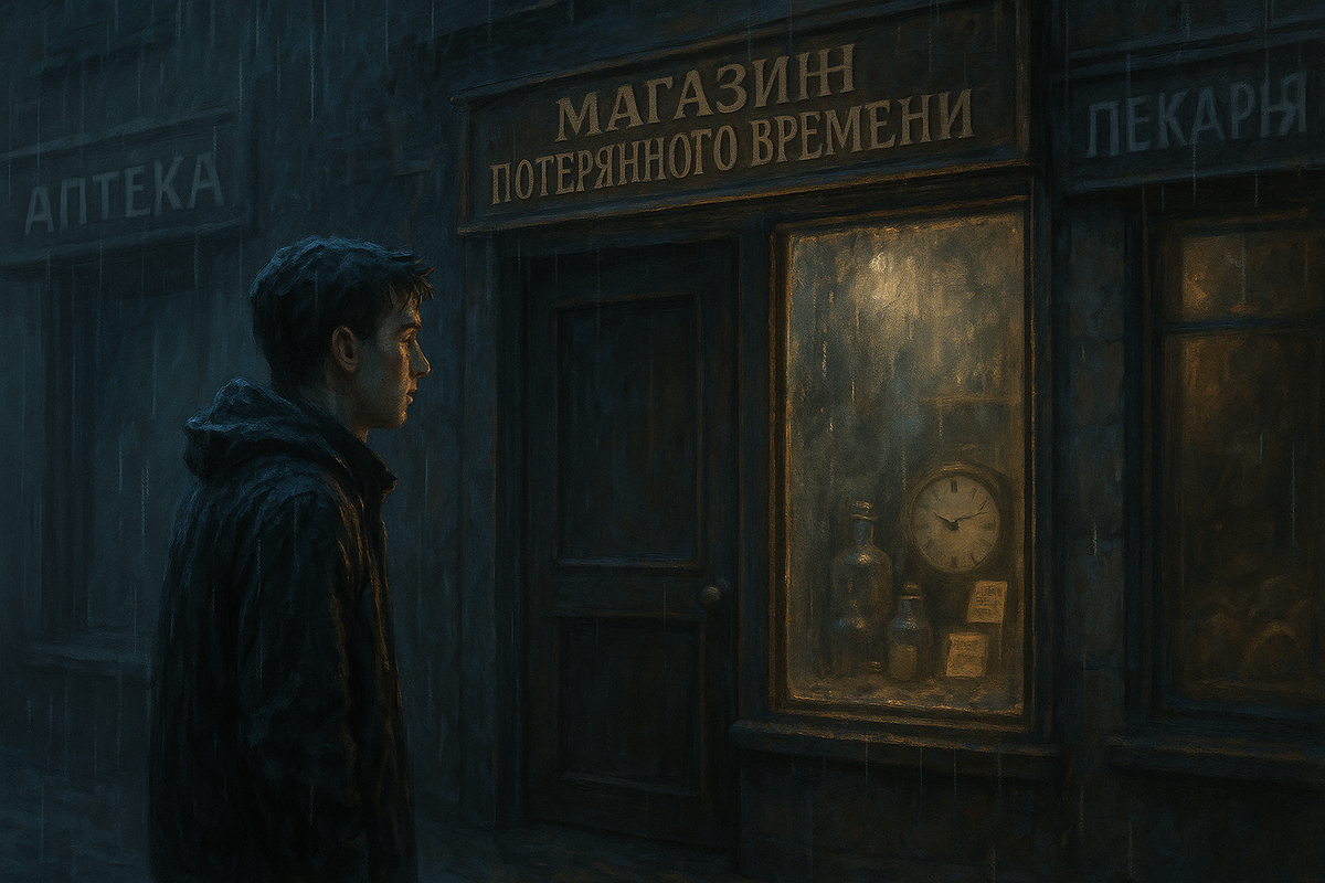В тот день он опоздал. Не сильно — на семь минут. Но для него это было непростительно. Метро встало, смартфон сел, дождь лил, как в кино. Павел шёл пешком, насквозь промокший, и именно тогда впервые заметил странную вывеску: «Магазин потерянного времени». Старая деревянная табличка, тёмные буквы, выцветшие от дождя. Магазин затерялся между аптекой и пекарней, словно его вставили в трещину реальности.
