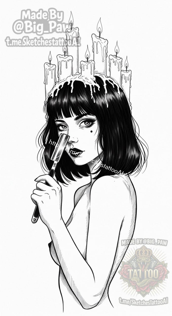 #2609 Подборка по запросу подписчика - Тату на плечо, чб, обножоной молодой девушки, в одной руке держит острую бритву, сверху над головой свечи догорают 😎 Такой контекст в большинстве случаев блокирует, да и как опасная бритва, в руках выглядит нейронка не особо знает. Миджорни вообще что угодно добавляет но не бритву, поэтому просто девочки 🧠 SYNTX 💳 Донат 😎 НейроБро 😎 Эскизы без вотера 💀 Эскизы от нейросети #девушка #бритва #свечи #эскиз #тату #татуировка