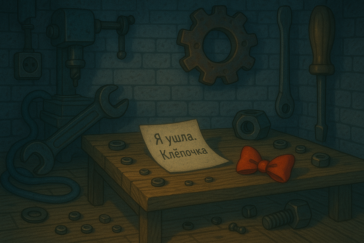 На следующее утро Болтик с Шайбочкой вошли в мастерскую… и замерли. Клёпочки не было. — Она что, проспала? — спросила Шайбочка, заглядывая под стол. — Нет… — Болтик подошёл к платформе. — Здесь записка. На листочке, аккуратно вырванном из тетрадки, было написано: «Я ушла. Вернусь до завтра. — К.Координаты: 952 0 ++123П» — Она... сама прыгнула?! — Шайбочка всплеснула руками. — Без нас?! Без наблюдения?! — Она хотела доказать, что телепорт безопасен, — пробормотал Болтик. — Или… она просто не выдержала. На панели «Проект П — ВКЛ.» горела тускло-розовая лампочка.