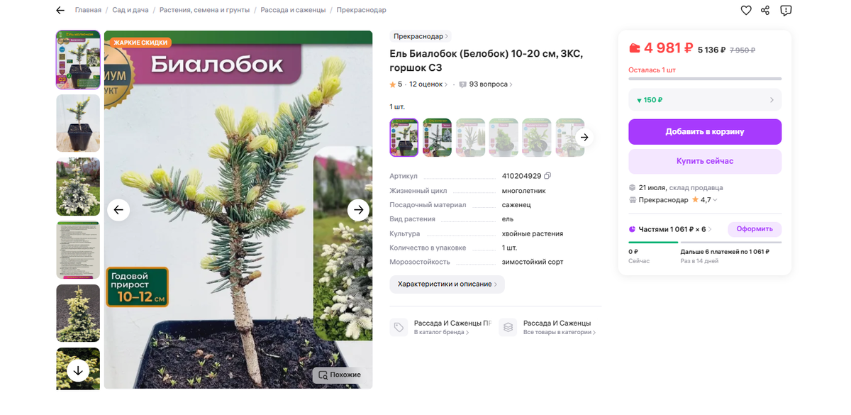 Начнем с самой, наверное, популярной среди новичков елколюбия ели - Белобок. Как и все модные популярные сорта, она много где продается, но ценник часто бывает очень кусачий. Так, например, на ВБ некоторые предлагают Белобок за почти 5 тыс: