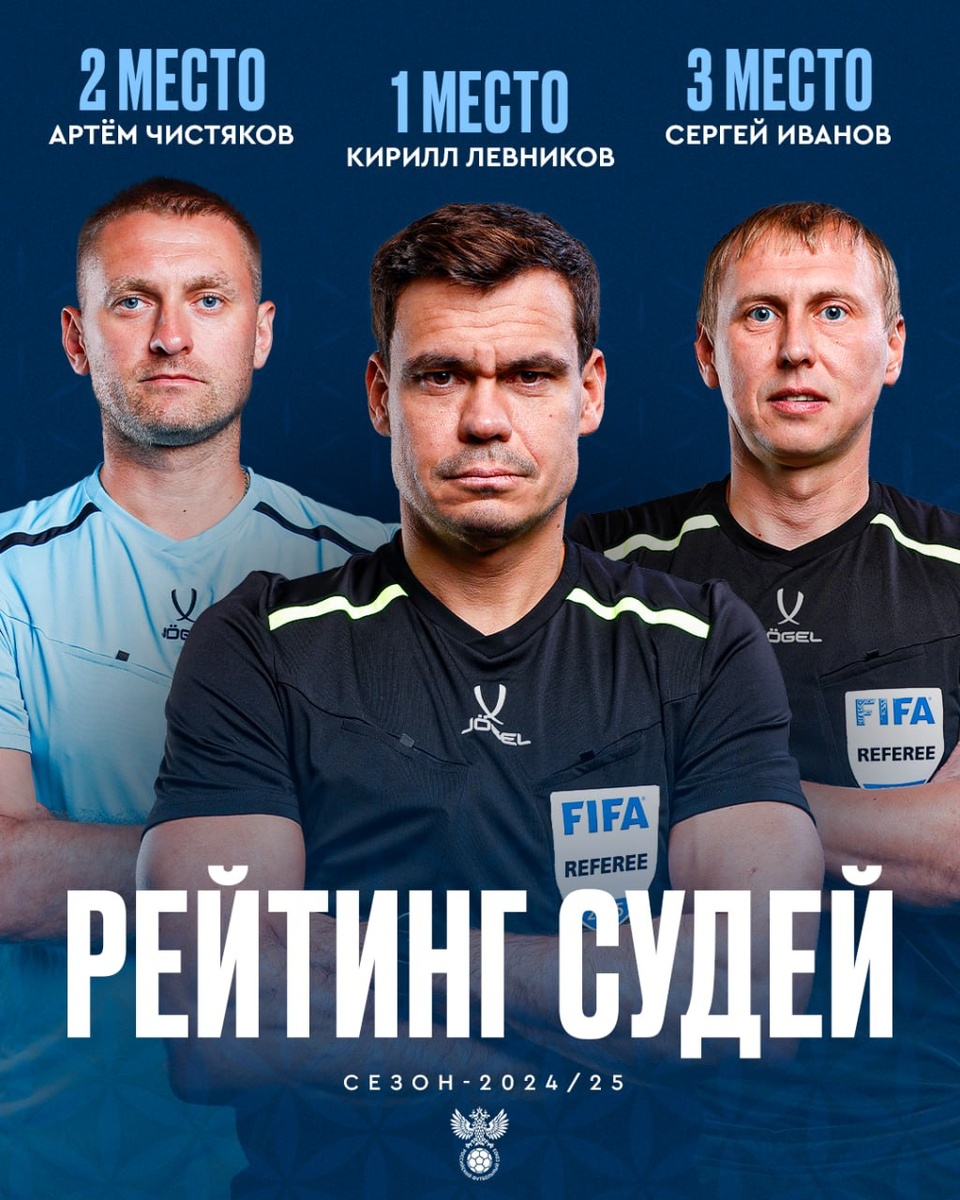 ⚽️ Кирилл Левников — лучший судья сезона-2024/25 Департамент судейства и инспектирования РФС представил рейтинг судей по итогам прошлого сезона. В топ-3 также попали Артём Чистяков и Сергей Иванов. Рейтинг рассчитывали среди судей, которые отработали в сезоне 10 и более матчей. Учитывались оценки департамента судейства, сложность и важность матча, постоянство и уровень фитнеса. @russian_rt_sport